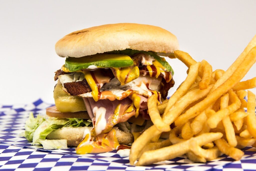 • Comidas rápidas: hamburguesas, pizzas y alimentos similares son ricos en grasas y calorías, y suelen tener poco valor nutricional.