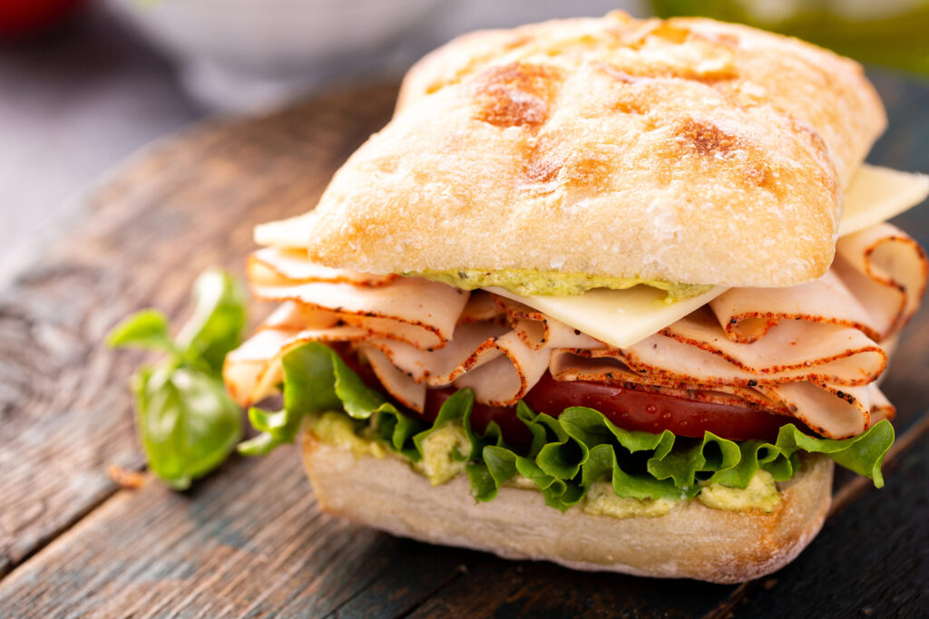 - Proteínas magras: opta por rellenar tu sándwich con carnes magras como pollo a la parrilla, pavo o pechuga de pavo.